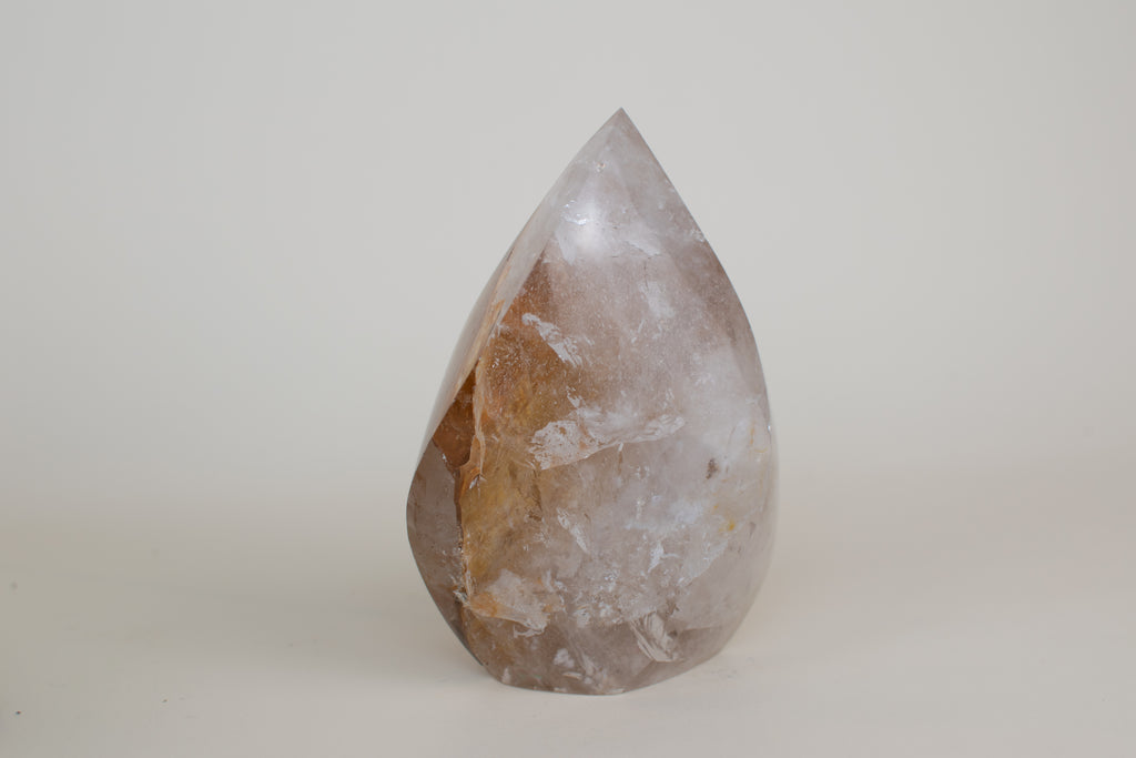 This sculpted Golden Healer quartz flame is a hand-polished masterpiece, revealing honeyed veins of warmth and inviting color. At 6.5 inches tall and over 3 lbs, this one-of-a-kind piece offers a powerful yet graceful presence, carrying the depth and beauty of a natural work of art.